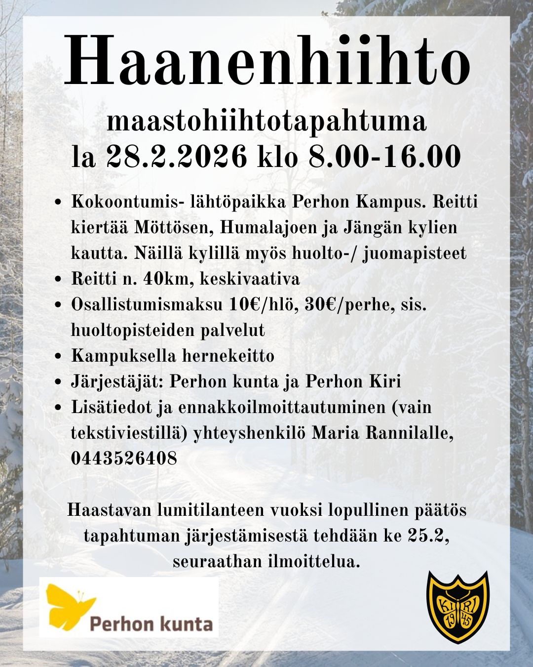 Perhon Kiri ry toimii urheilun yleisseurana. Seuran lajeihin kuuluvat hiihto, paini, suunnistus ja yleisurheilu sekä joukkuelajeina pesäpallo ja lentopallo.